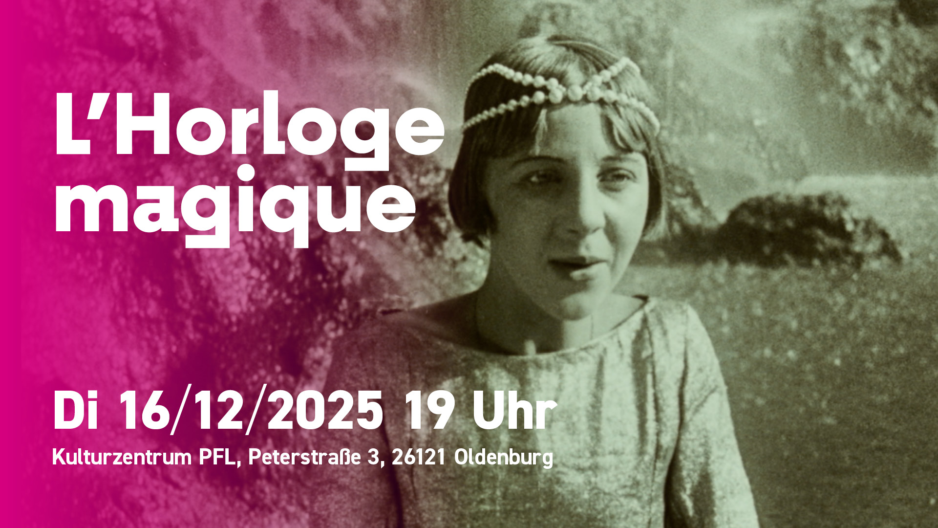 Stummfilm mit Live-Musik:Ein Kino-Konzert-Erlebnis wie vor 100 JahrenLadislas Starewitch, Paul Dessau, Bernd Thewes"Die Wunderuhr" Kulturzentrum PFL Oldenburg Zum Jahresabschluss widmet sich das oh ton-ensemble der Filmmusik. Der russische Regisseur und Pionier der Trickfilmtechnik Ladislas Starewitch schuf 1928 mit „Die Wunderuhr“ (L'Horloge magique) einen frühen Klassiker des Genres, der Realfilm und Trickfilm zauberhaft verschmilzt. Der Mainzer Komponist Bernd Thewes - ... Weiterlesen ...
